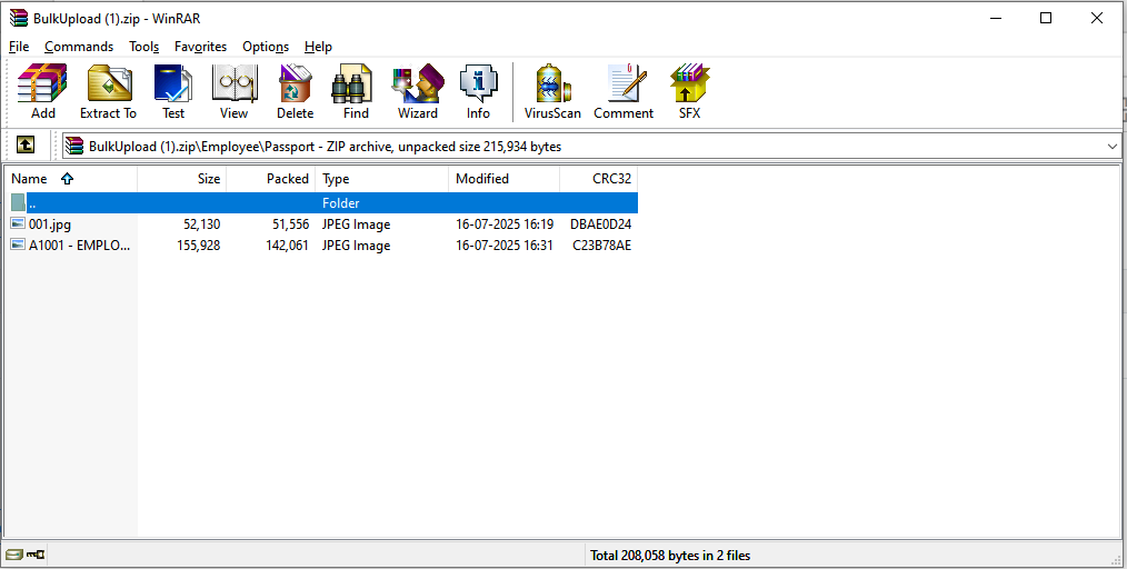 - Upload Document – Allows you to upload a document. (Note: Please ensure the document is included in the same bulk upload ZIP file with the employee code before uploading.)
