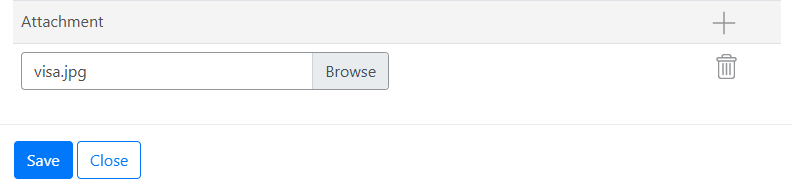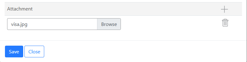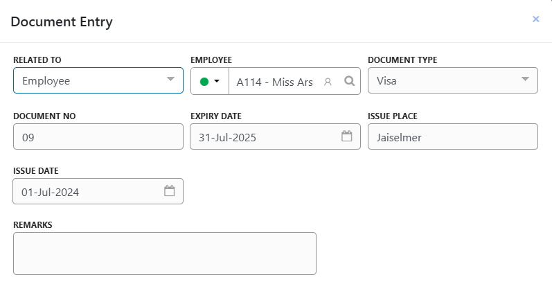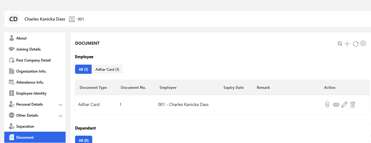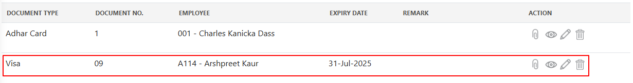 - Once uploaded, the document will appear on the screen, displaying its type, document number, employee code (if applicable), expiry date, remarks, and available actions, such as viewing the attachment, viewing the entry, editing, or deleting the document.