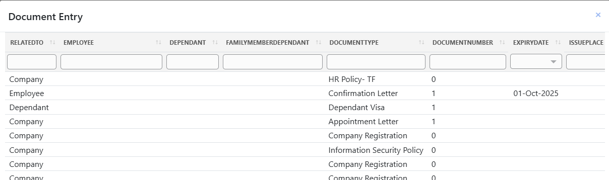 - When you click the icon, a screen will appear showing a list of documents. You can refine your search using the fields provided, such as employee code, document type, or related entity.