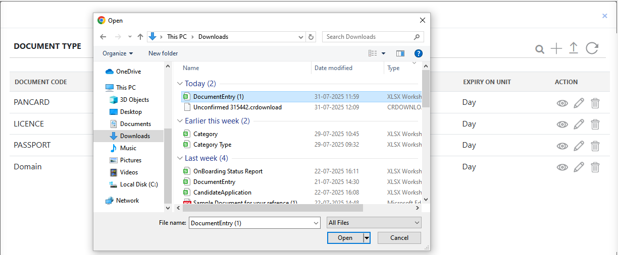 - Upload Document – Allows you to upload a document. (Note: Please ensure the document is included in the same bulk upload ZIP file with the employee code before uploading.)