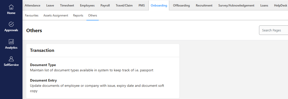 - Go to Selfservice > Onboarding > Others > Document Entry, or simply search for ‘Document Entry’ in the search bar of the home screen.