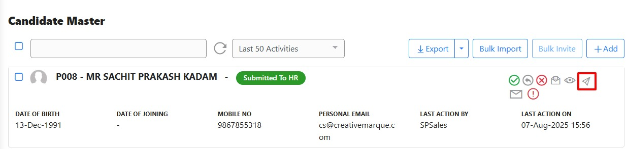 Go to Organization > Onboarding > Candidate Master, or simply search for Candidate master in the search bar.
