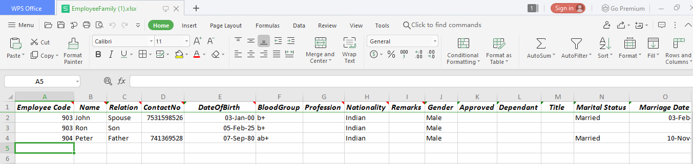 - Click ‘Download Template’ to download the Excel file named EmployeeFamily.xlsx.