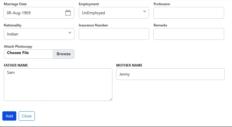- Click the ‘+’ icon to add family details. A new screen will appear. Steps are the same as above from 4th point.