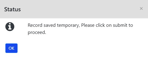 - If all the required fields are filled, you will receive a “Record saved temporary, Please click on submit to proceed” message.