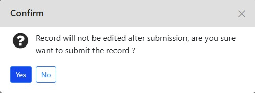 - A confirmation message will appear: “Record will not be edited after submission, are you sure you want to submit the record?”