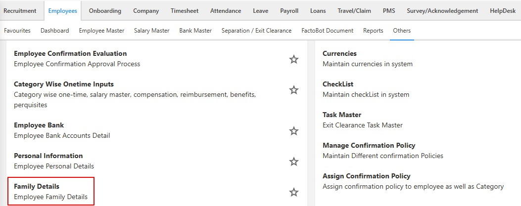 - To add an employee’s family details, go to Organizations > Employee > Employee Master, or simply search for ‘Employee Master’ in the search bar.
