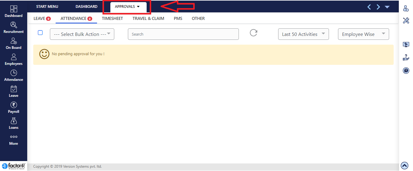 Approval panel has separate tabs for requests like Leave, Attendance, Timesheet etc.