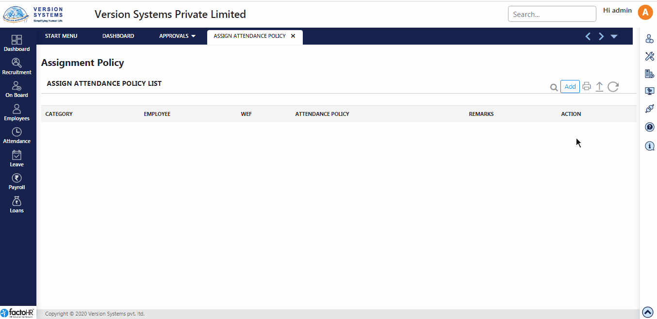 We have understood how to create Attendance Policies using Manage Attendance Policy module. Policy marked as “Is Default” is applicable to all the employees in the organization without any assignment. But if multiple policies are created for different branch, location or group of employees then assignment of the policy to particular category or individual employee can be done in this module.