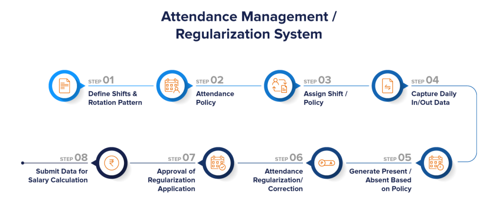 Attendance Management or Attendance Regularization process refers to tracking of employees working hours with respect to office timing and finally preparing attendance data for salary calculation.