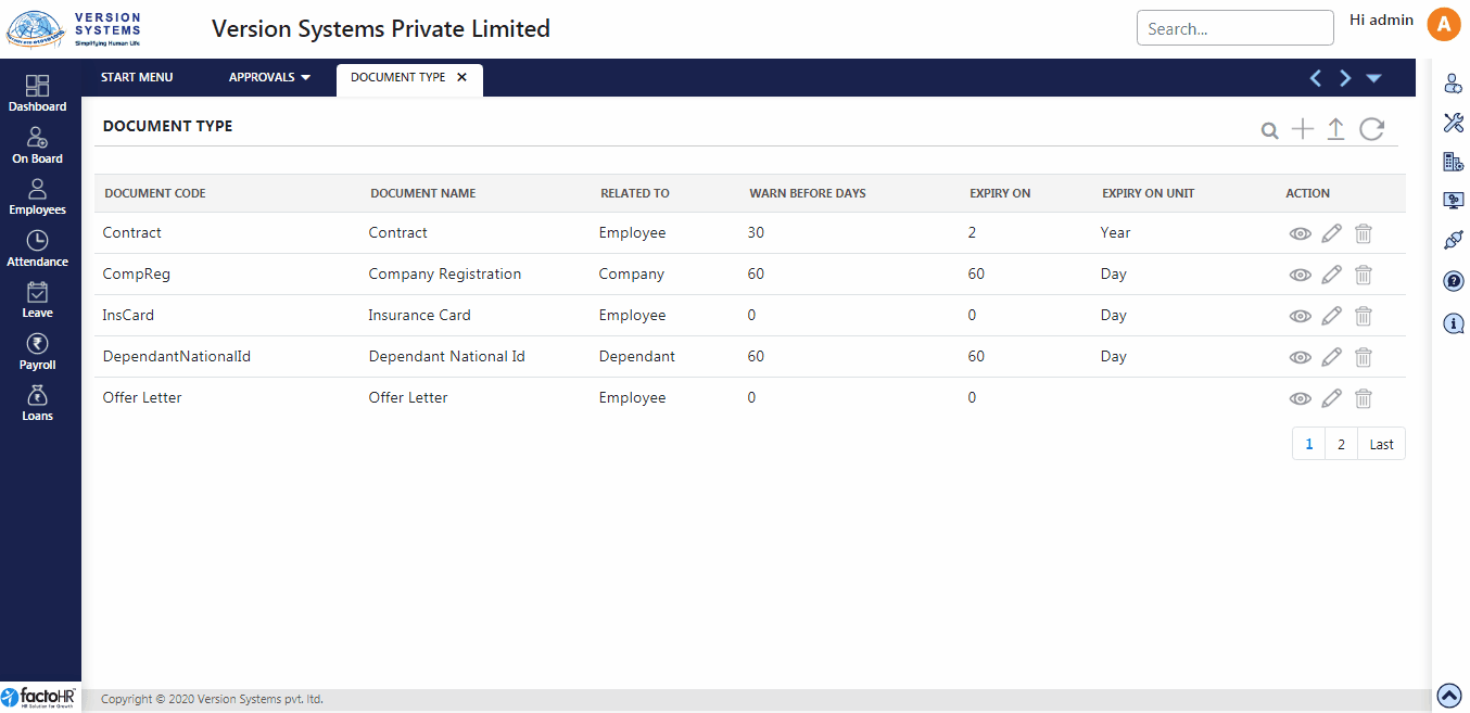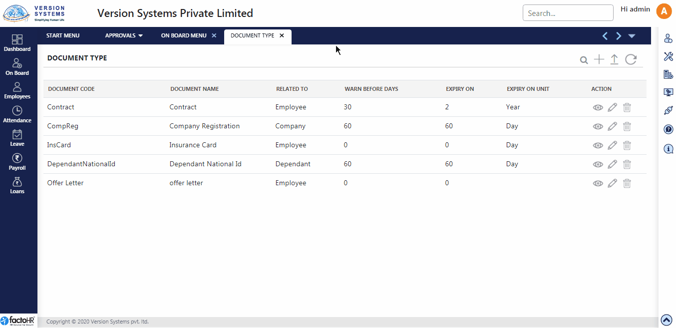 - There are buttons provided under Action Column. If you want to view the created document type then click on eye icon.