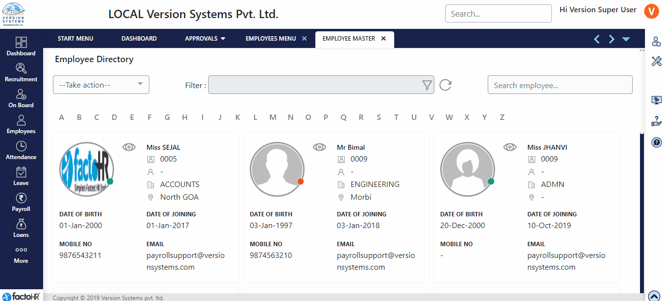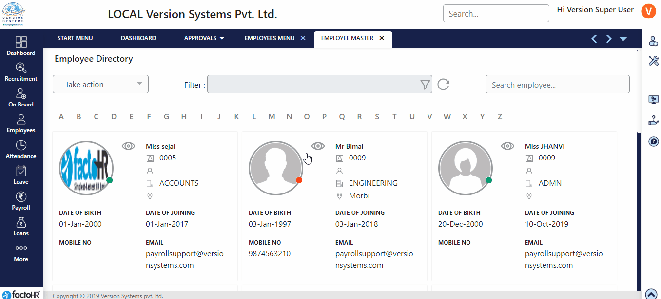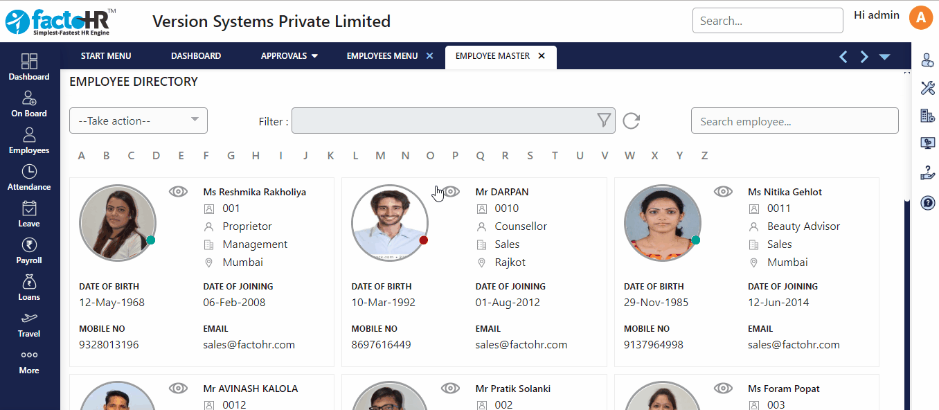 Clicking on Employee master will first show you Employee Directory. Here, list of employees is displayed with their basic information and profile picture.