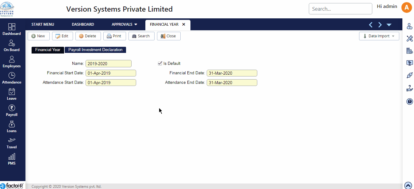 Financial Year is defined for Payroll and Attendance purpose.