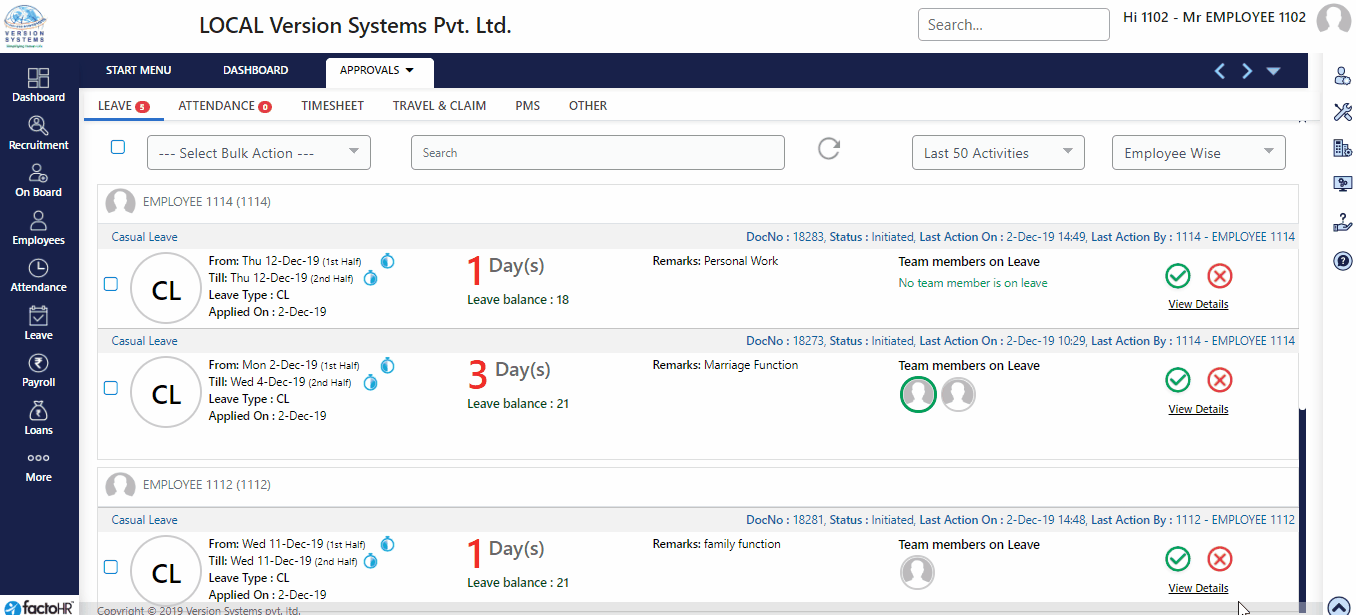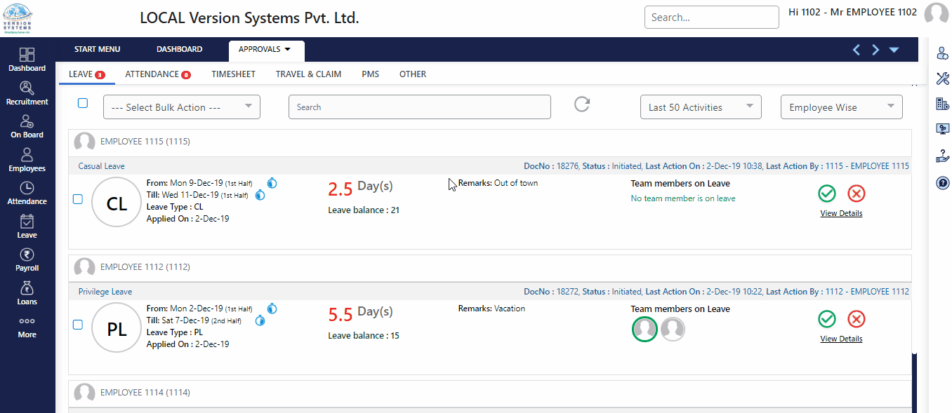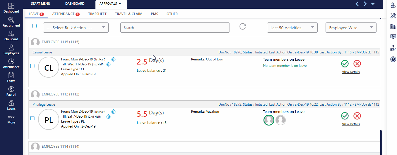 - Also there is Bulk Approval/Rejection option. You can select request in bulk and take relevant action. It will also allow you to share remarks and notify other employees too.