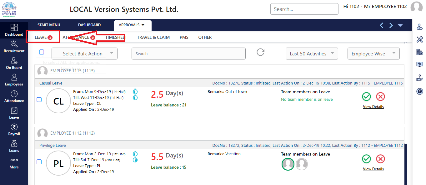 - Team Leaders or Managers or Department Heads either Approve or Reject the application.