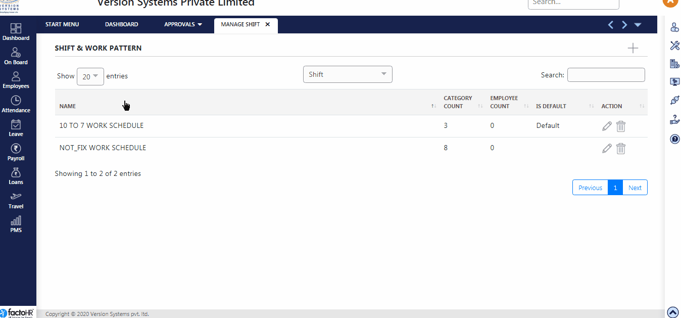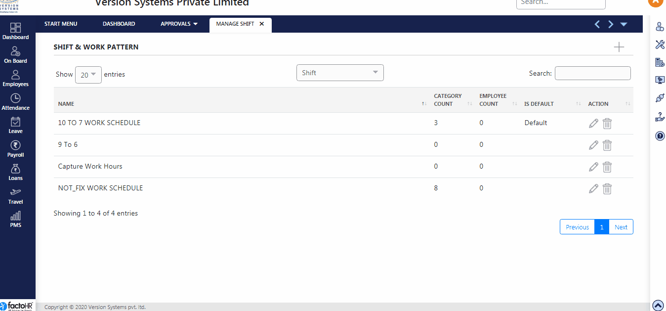 The table provides details like Shift Name, Count of Category and Employee the shift is assigned to and whether the shift is default. Each shift can be edited or deleted using the button provided in the same row.