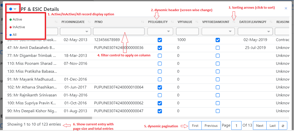 8) At bottom left corner it will display current entry with page size (10 records per page) and total entries.