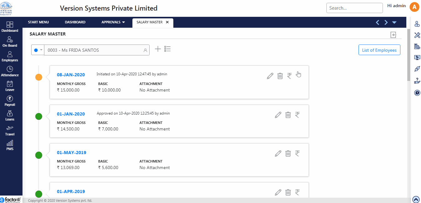 - Below the search control, all the salary revisions of the selected employee are displayed in separate panels reflecting CTC, Monthly Gross, Basic salary and Attachment.